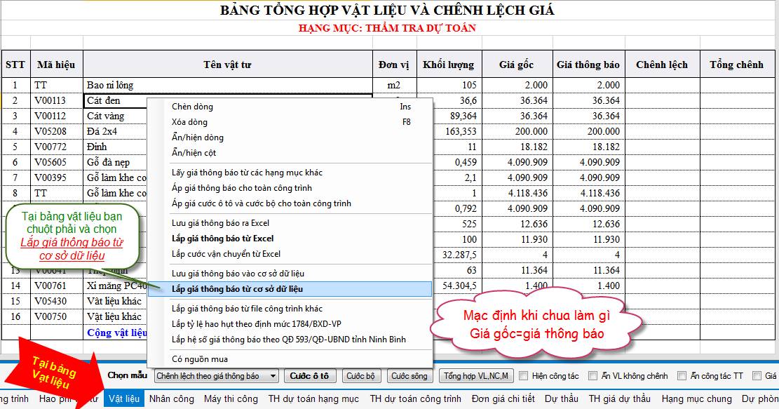 Tại bảng vật liệu ta sẽ nhập giá thông báo tháng tại thời điểm lập dự toán vào cột giá thông báo (với phần mềm dự toán F1 bạn chỉ cần chuột phải và “Lắp giá thông báo từ cơ sở dữ liệu” là được).