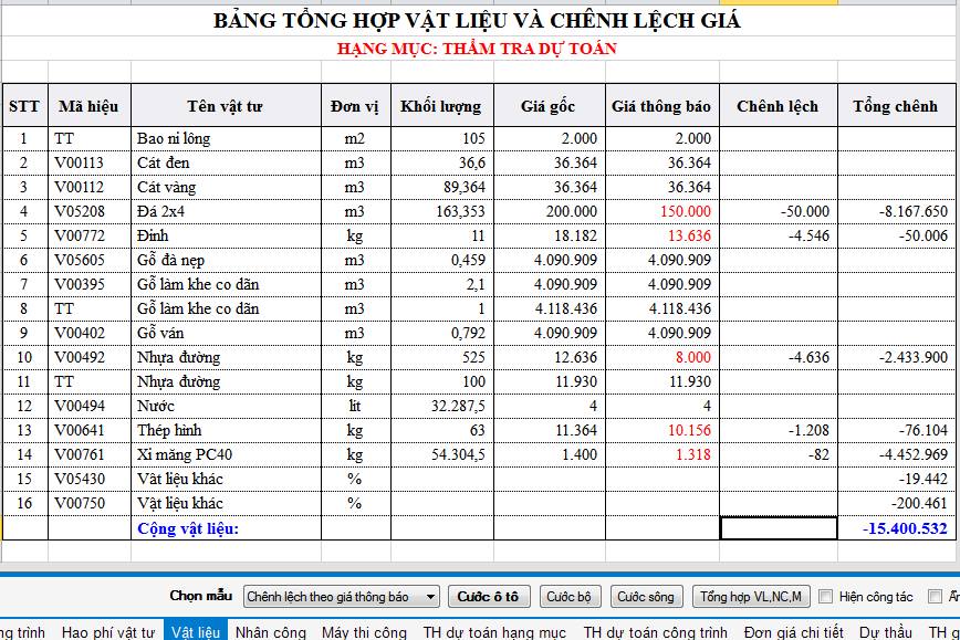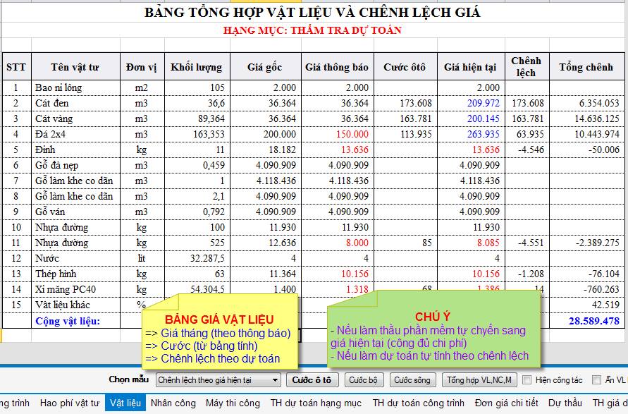 Quay lại bảng vật liệu sẽ thấy bảng vật liệu đầy đủ chi phí bao gồm cả cước ô tô và giá thông báo của Sở và các số liệu khác được thể hiện ở đây.