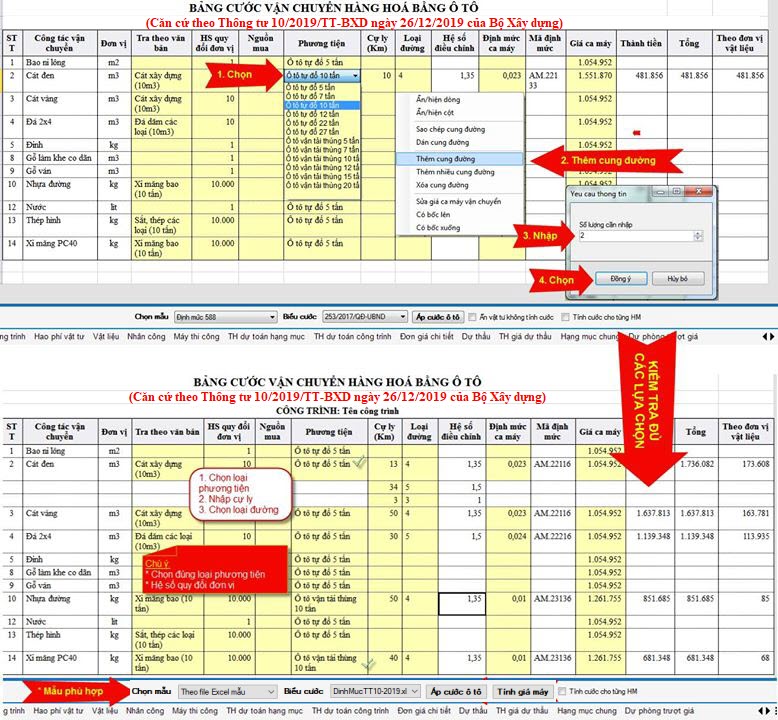 Để tính toán được bảng này bạn làm theo thứ tự như trên hình vẽ. Chọn loại phương tiện tương ứng loại vật liệu (nếu bạn chọn không đúng cước sẽ không chạy ví dụ: Xi măng chọn xe “Tự đổ” hoặc “Đá” mà chọn “Ô tô thùng” phần mềm sẽ không tra cho bạn) sau khi chọn xong loại phương tiện bạn tiến hành nhập cự ly và loại đường cần tính (nếu đi qua nhiều cung đường bạn chuột phải và chọn “Thêm nhiều cung đường” như hình) sau kh chịn xong và tính toán xong bạn nhấn “Áp cước”.