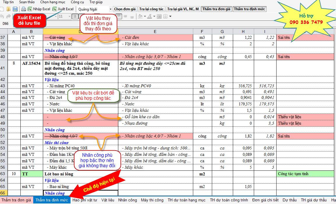 - Ở hình trên các dòng bị gạch là giá trị bị sai so với đơn giá gốc được công bố. Bảng này sai nhiều là vì đang sử dụng đơn giá hiện tại nên khác với đơn giá gốc. Cột nhân công có màu vàng và không gạch đây là bảng giá gốc (do dùng gia gốc nhân hệ số) sau này nhân hệ số bên bảng tổng hợp nên bảng này để nguyên giá trị gốc theo đúng công bố trong bộ đơn giá công trình nên phần mềm không gạch.