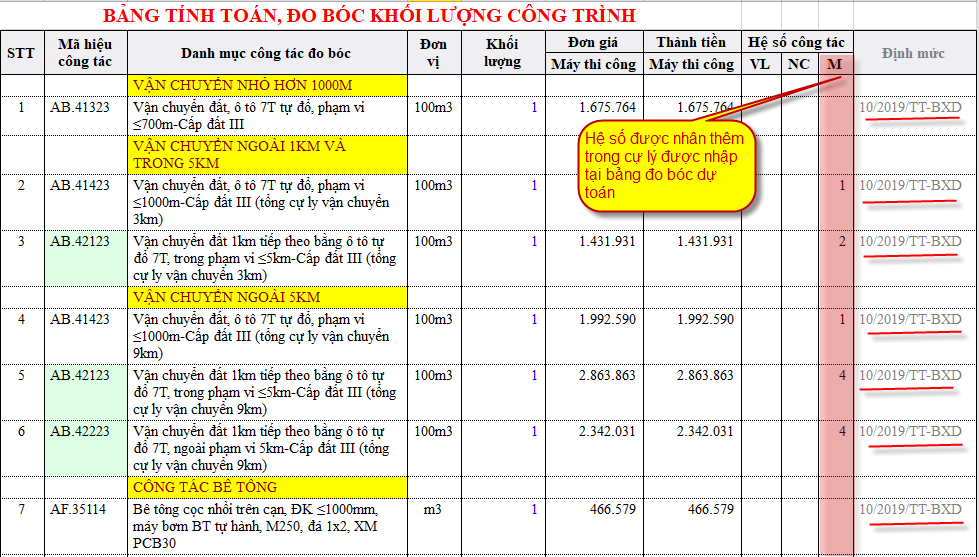 Theo cách tính mới này thì khi cự ly vận chuyển >300m và <1000m thì đuợc lấy theo mã công tác theo cự ly 300m, 500m, 700m và 1000m (các số chẵn được làm tròn lên).
