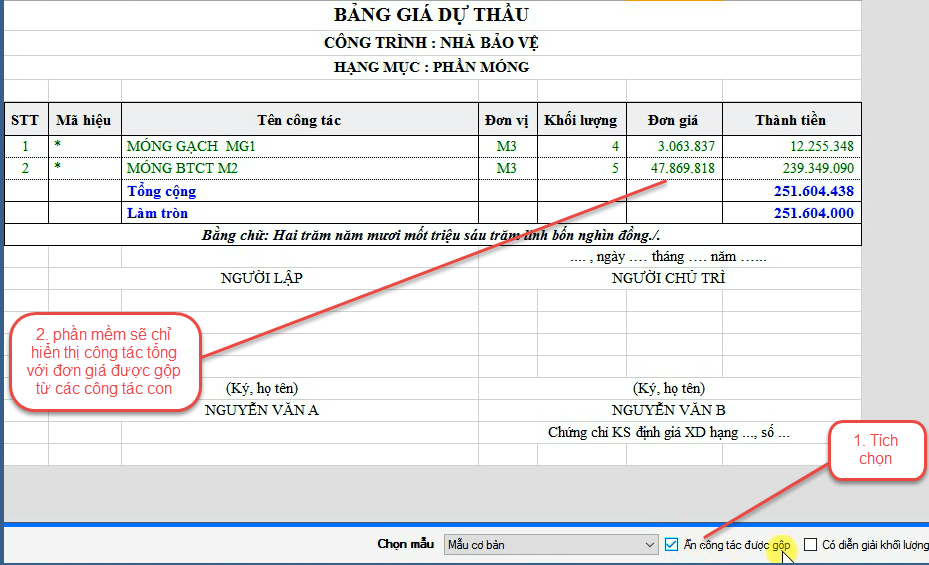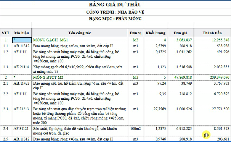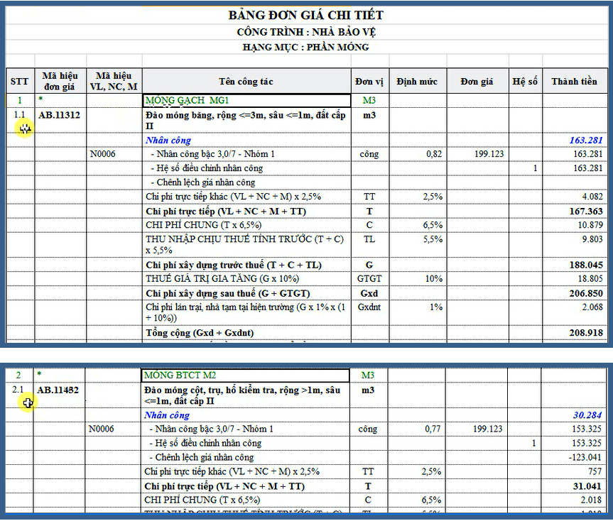 Kết quả bên bảng “Đơn giá chi tiết“:
