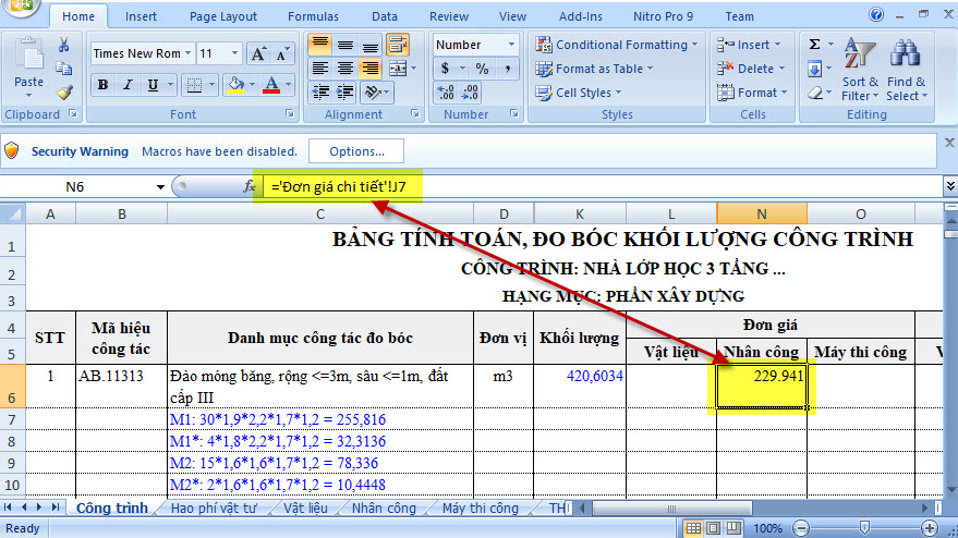 Đơn giá ở bảng “Công trình” sẽ được lấy từ bảng “Đơn giá chi tiết“: giữ nguyên link công thức khi xuất Excel