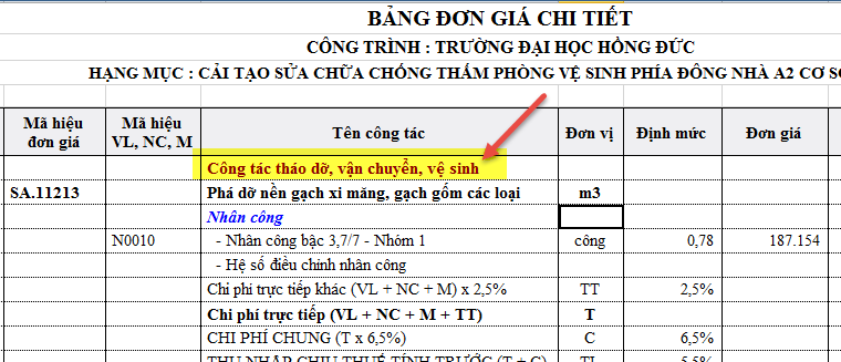 * Đơn giá chi tiết cho mỗi công tác trong nhóm