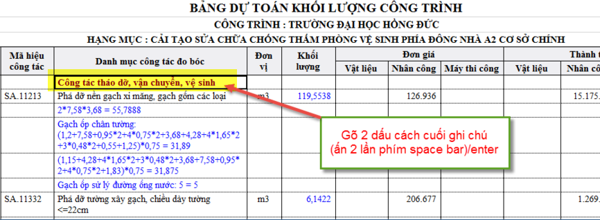 Hiển thị ghi chú công tác ở bảng “Công trình” sang bảng “Đơn giá chi tiết” và bảng “Dự thầu”. Nhấn phím cách 2 lần ở cuối ghi chú, sau đó nhấn phím Enter