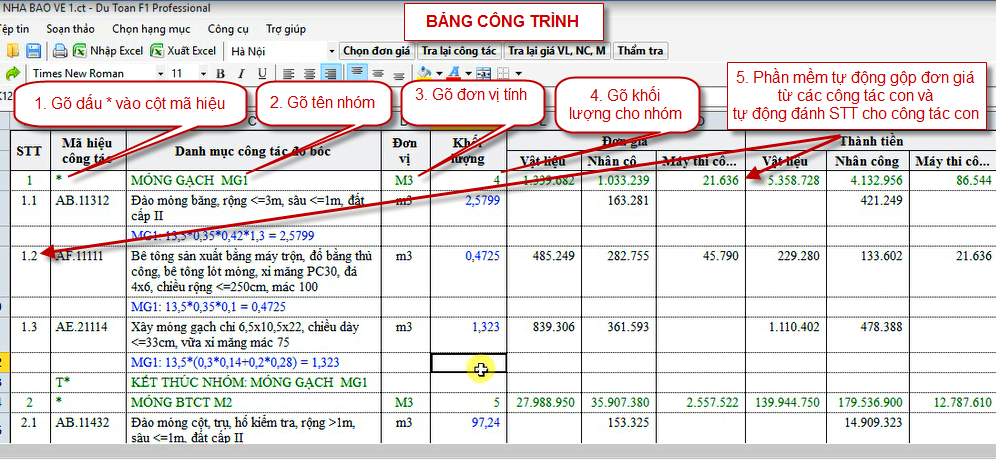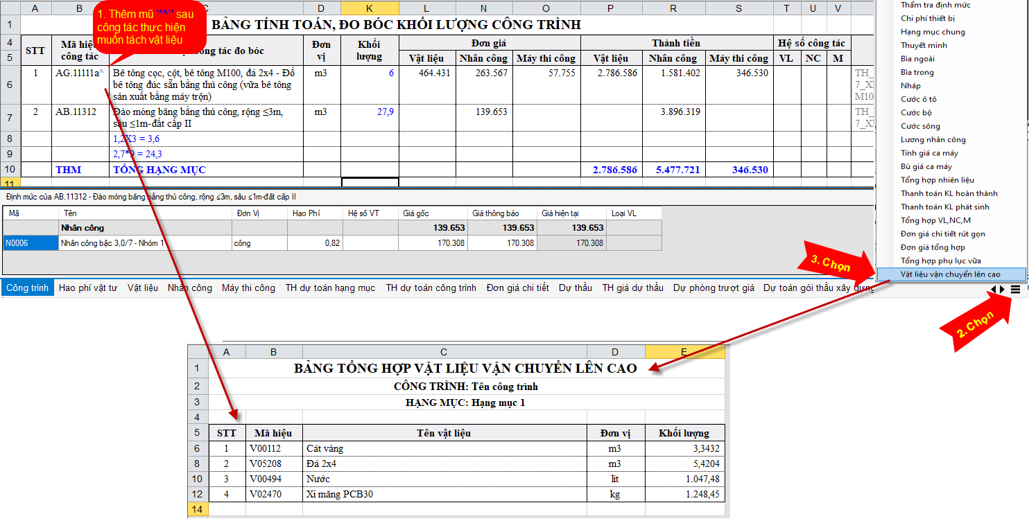 Bạn nhập công tác và khối lượng ở bảng “Công trình” đầy đủ, sau đó làm tiếp các bước sau: