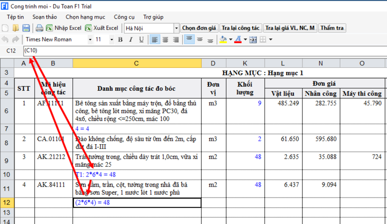 Link ngược kết quả từ bảng “Đơn giá chi tiết” vào bảng “Công trình”, hay còn gọi là phương pháp lập đơn giá trực tiếp. Cách thực hiện như sau