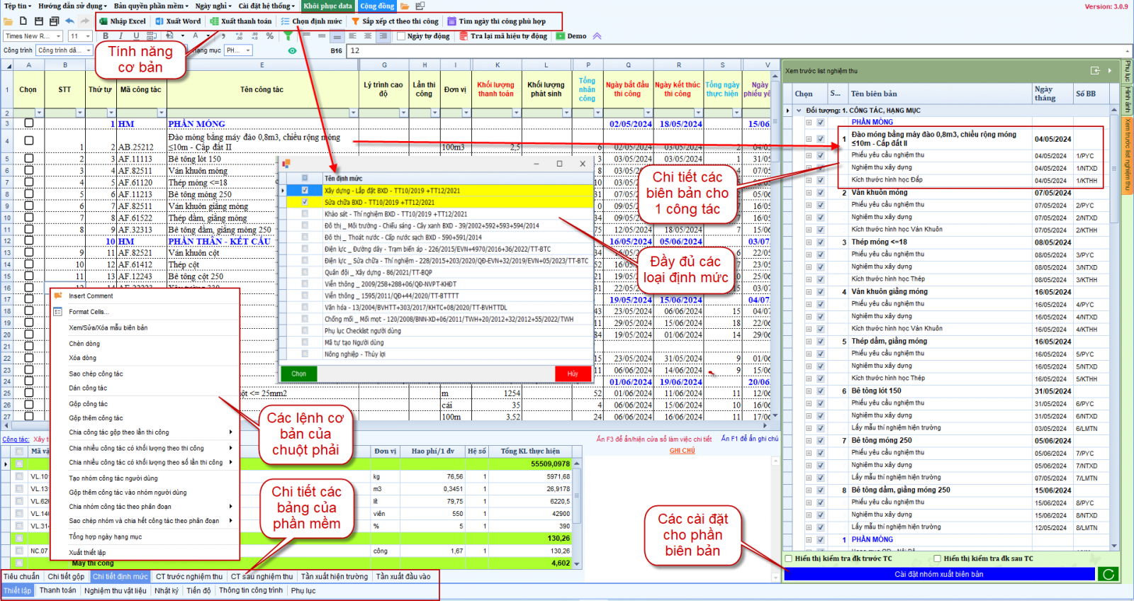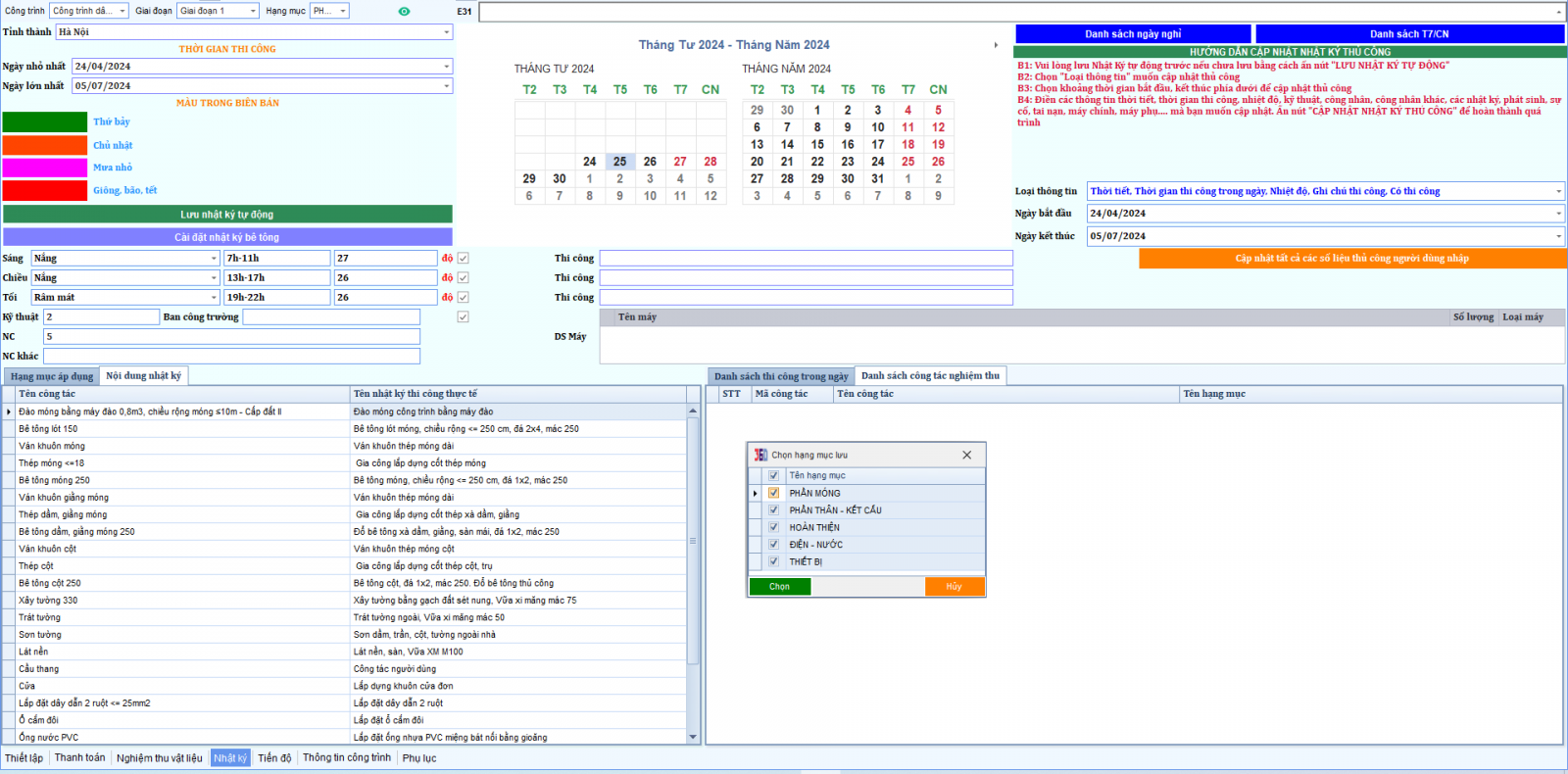 - Nhật ký thi công chạy tự động và đồng bộ công tác nghiệm thu. Tự tính toán số lượng nhân công, loại máy theo các định mức BXD mới nhất