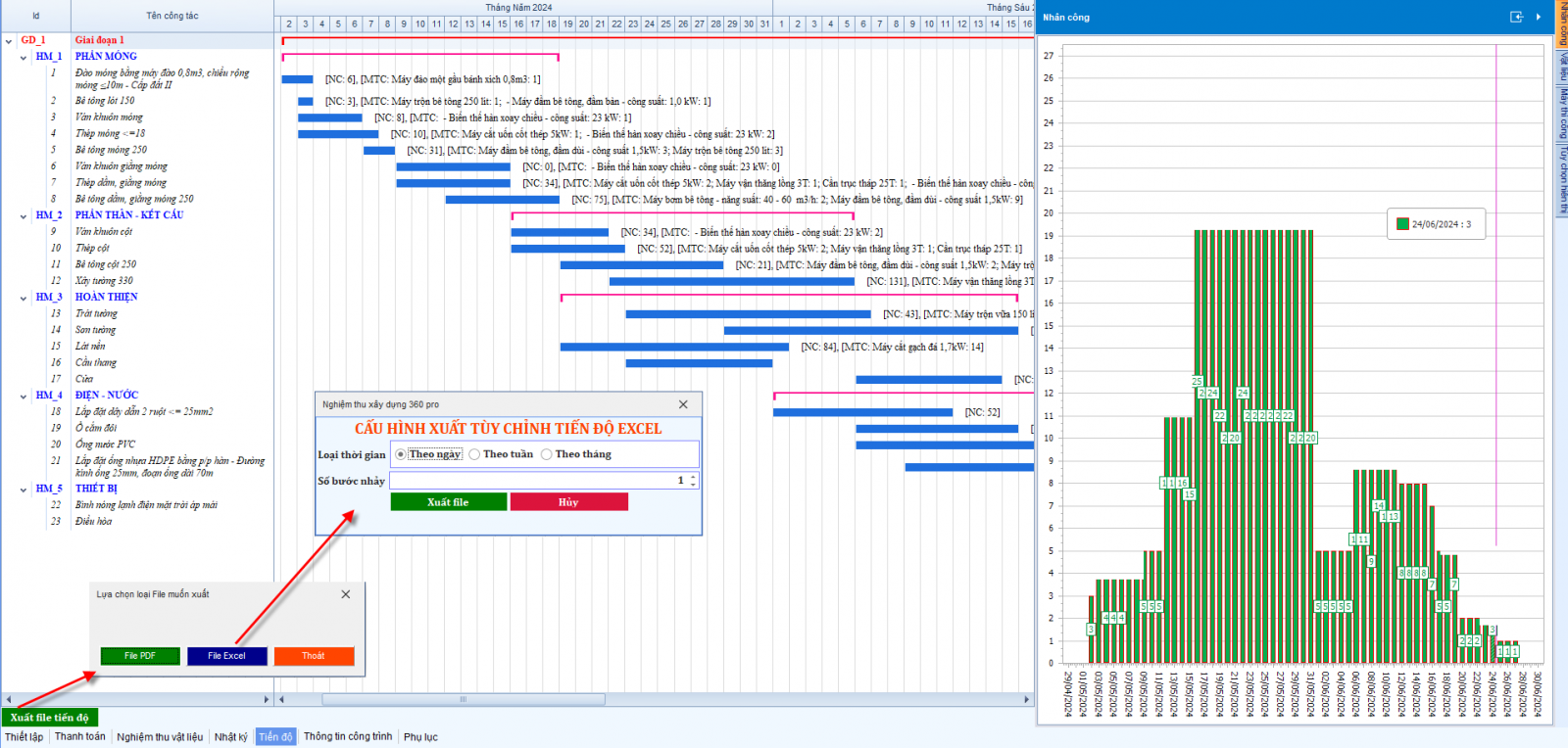 - Tiến độ thi công tự phân tích theo số liệu cài đặt tại bản thiết lập có đủ biểu đồ nhân công, biểu đồ máy, biểu đồ vật liệu.