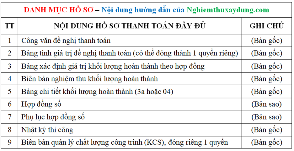 Để thanh toán được khối lượng đã thực hiện tại hiện trường cần thực hiện đầy đủ các nội dung sau: