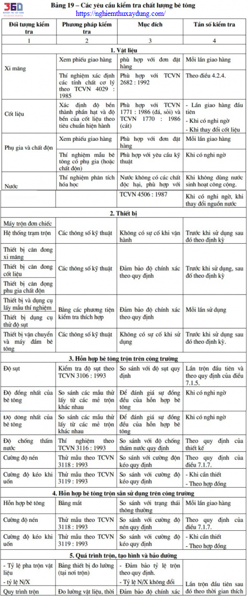 Các nội dung chi tiết công tác nghiệm thu bê tông và bê tông thương phẩm được quy định trong TC4453-1995 gồm