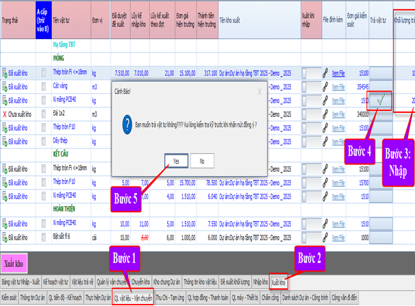 • Chọn Yes để thực hiện trả vật tư về kho cũ trước khi xuất.