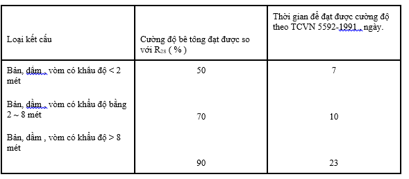- Điều 3.6.6 của TCVN 4453-95 ghi rõ: Đối với công trình xây dựng trong khu vực có động đất và đối với các công trình đặc biệt, trị số cường độ bê tông cần đạt để tháo dỡ cốp-pha chịu lực do thiết kế qui định.