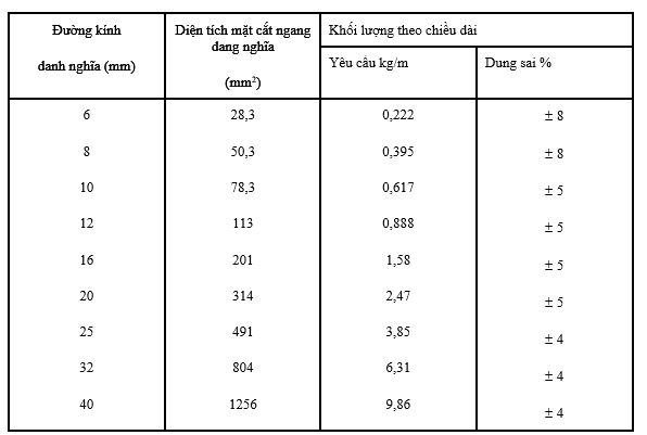 Cột đầu cho ta kích thước danh nghĩa, điều này có thể hiểu là khi chọn tiết diện trong tính toán , thép được chọn theo diện tích chịu lực ở cột 2 và được coi đường kính thanh tương ứng với cột 1. Nhưng do bề ngoài đường kính có gờ nên đường kính thanh này chỉ là danh nghĩa, không thể đo chỗ lõm rồi cộng với đo chỗ lồi của gờ mà chia bình quân. Cách làm tốt là chặt 1 hay 2 mét rồi cân, theo bảng này ta suy được đường kính danh nghĩa.