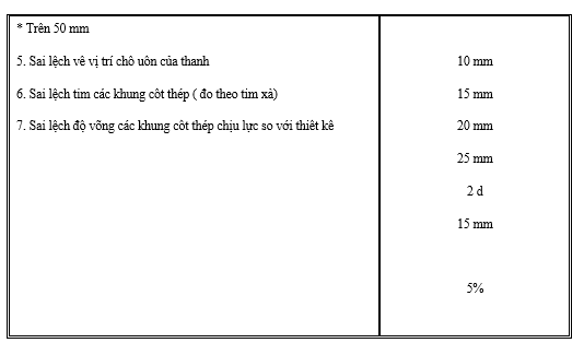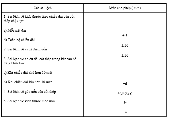 Khi cắt và uốn cốt thép theo lô thì cứ 100 thanh thép đã gia công sẽ lấy năm thanh bất kỳ để kiểm tra. Trị số sai lệch không được vượt quá số liệu cho trong bảng dưới đây: