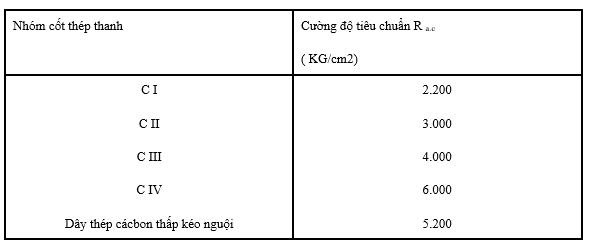 Cường độ tiêu chuẩn của các nhóm thép cán nóng để đối chiếu với các loại thép cần thí nghiệm để xác định cường độ cho trong bảng: