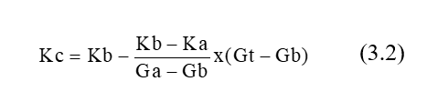 - Trường hợp quy mô chi phí trực tiếp nằm trong khoảng quy mô chi phí tại Bảng 3.7 thì định mức tỷ lệ chi phí chung (Kc) được xác định bằng phương pháp nội suy theo công thức sau:
