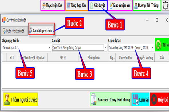 • Sau khi điền đầy đủ thông tin các Bước duyệt, nhấn nút “Lưu lại” để hoàn thành và áp dụng.