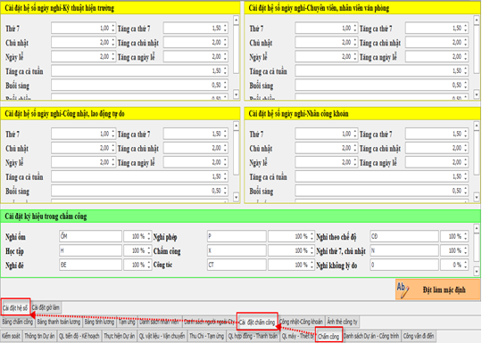 Thứ 7, Chủ nhật, Ngày lễ: cho phép nhập hệ số công (1.0, 2.0...) và hệ số tăng ca tương ứng.