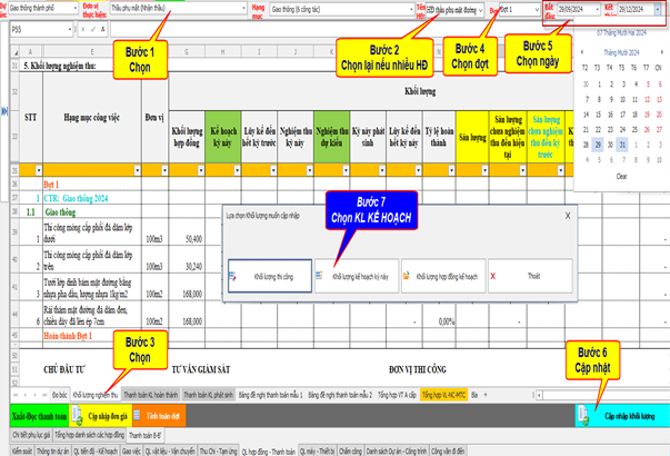 Cách cập nhật KẾ HOẠCH tương tự như cách cập nhật khối lượng nghiệm thu, tuy nhiên ở bước cuối bạn cần chọn nút “Khối lượng kế hoạch kỳ này”, các thao tác còn lại giống như phần cập nhật khối lượng nghiệm thu.