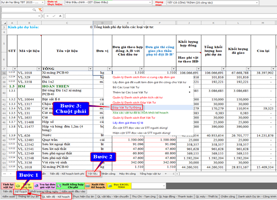 Tiếp theo lựa chọn xuất bảng kế hoạch vật tư ra theo các Bước tiếp theo sau