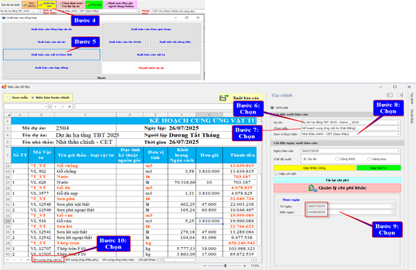 Bước 4: Tại cửa sổ hiện ra, chọn “Xuất báo cáo vật tư theo Dự án”