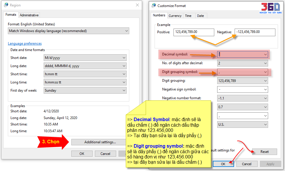 => Decimal Symbol: mặc định sẽ là dấu chấm (.) để ngăn cách dấu thập phân như 123.456,000