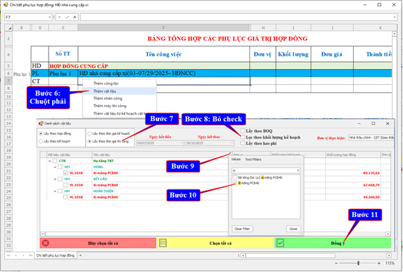 → chọn "Thêm vật liệu" để mở giao diện danh sách vật liệu cần bổ sung vào hợp đồng.