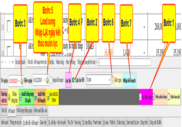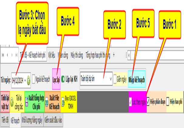 Ở bước này, người dùng chỉ cần chọn ngày bắt đầu muốn hệ thống tự động phân bổ lại khối lượng. Sau đó nhấn nút “Lọc lại” để hệ thống nhận diện phạm vi ngày mới. Tiếp theo, chỉ cần nhấn “Nhập lại kế hoạch”, toàn bộ khối lượng kế hoạch sẽ được hệ thống tự động phân bổ từ ngày lọc cho đến cuối dự án, ngoại trừ những ngày đã có khối lượng thi công thực tế mà người dùng đã nhập trước đó.