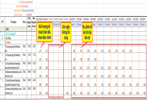 Sau khi đã điều chỉnh bằng các tính năng như “Nhập lại kế hoạch”, “Giãn ngày”, hoặc các thao tác phân bổ khác, khi người dùng thực hiện thao tác xuất dữ liệu, hệ thống sẽ hiển thị đầy đủ và chi tiết khối lượng được phân bổ theo từng ngày.