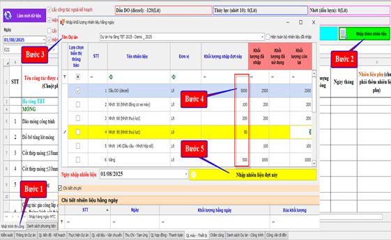 Trong tab “Nhật trình thi công”, nhấn vào nút “Nhập thêm nhiên liệu” có màu xanh, để mở bảng nhập liệu theo từng loại nhiên liệu.