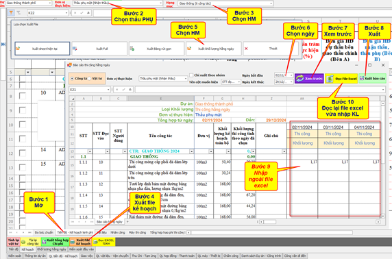 Phân khai, đồng bộ tiến độ thầu phụ; lập, xuất, chỉnh sửa và đọc tiến độ từ Excel để cập nhật, kiểm tra và hoàn thiện kế hoạch.