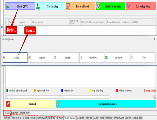 Sau khi nhấn “Lấy từ QLVC”, phần mềm sẽ hiển thị một bảng chọn các loại nghiệp vụ. Tại đây, bạn click vào nút “Đề xuất” để lập phiếu đề xuất từ danh sách vật tư được truy xuất.