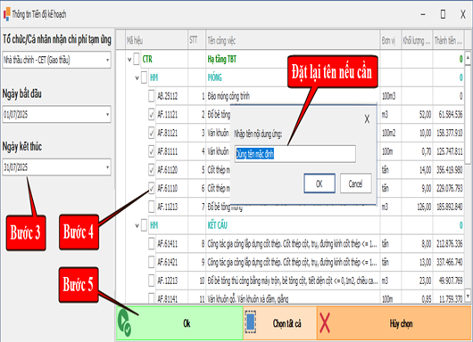 • Hệ thống sẽ tự động lọc ra các công việc trong giai đoạn đó để bạn dễ dàng chọn đúng khối lượng thực tế theo tiến độ.