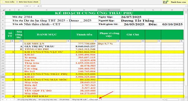 Hệ thống sẽ tự động tổng hợp các chi phí tạm tính (bao gồm: chi phí thầu phụ, vật tư, nhân công, thiết bị, chi phí chung, chi phí khác, thuế, v.v.).