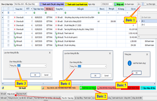 Kết quả: File báo cáo chi phí/thanh toán theo tháng được tạo tự động, có thể dùng cho in ấn, lưu trữ, hoặc gửi cho Chủ đầu tư/Kế toán.